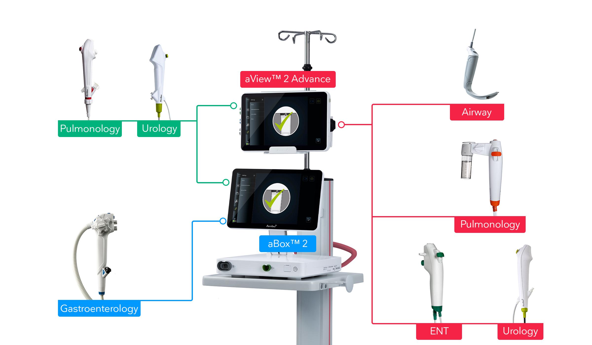Our family of visualization devices revolves around the Ambu® aView™ 2 Advance and Ambu® aBox™ 2 endoscopy systems.