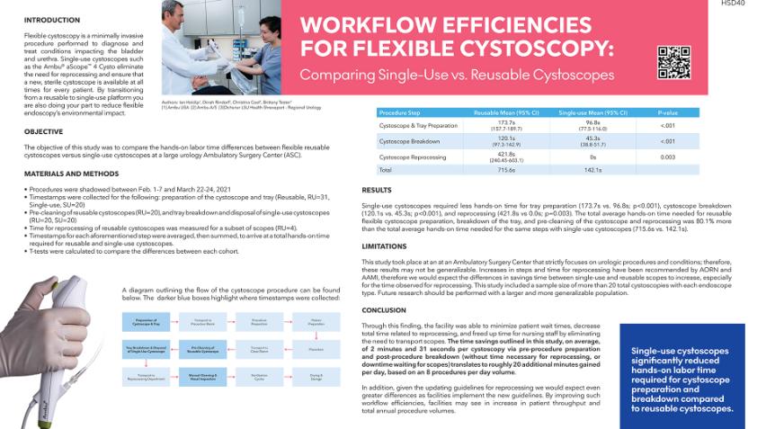 A high-volume urology clinic evaluated the differences in workflow efficiency and user satisfaction between single-use and reusable cystoscopes. Single-use cystoscopes saved 7:40 of staff time per procedure compared to reusable cystoscopes, and received an excellent rating across all quality measures by providers.