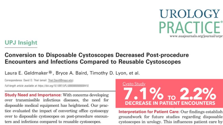Research from the Mayo Clinic in Jacksonville indicates that the use of single-use cystoscopes was associated with fewer post-procedure encounters compared to reusable cystoscopes, with a decrease from 7.1% to 2.2%. The study also found lower rates of positive urine cultures and fewer hospitalizations.